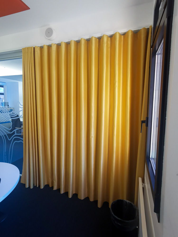 Per la sala riunioni abbiamo scelto tende Wave oscuranti in tonalità giallo intenso, realizzate con il tessuto Universal di Création Baumann nella versione blackout. Il colore, vivace e distintivo, dona energia all’ambiente e crea un contrasto moderno, mentre la struttura Wave assicura una caduta omogenea e ordinata.