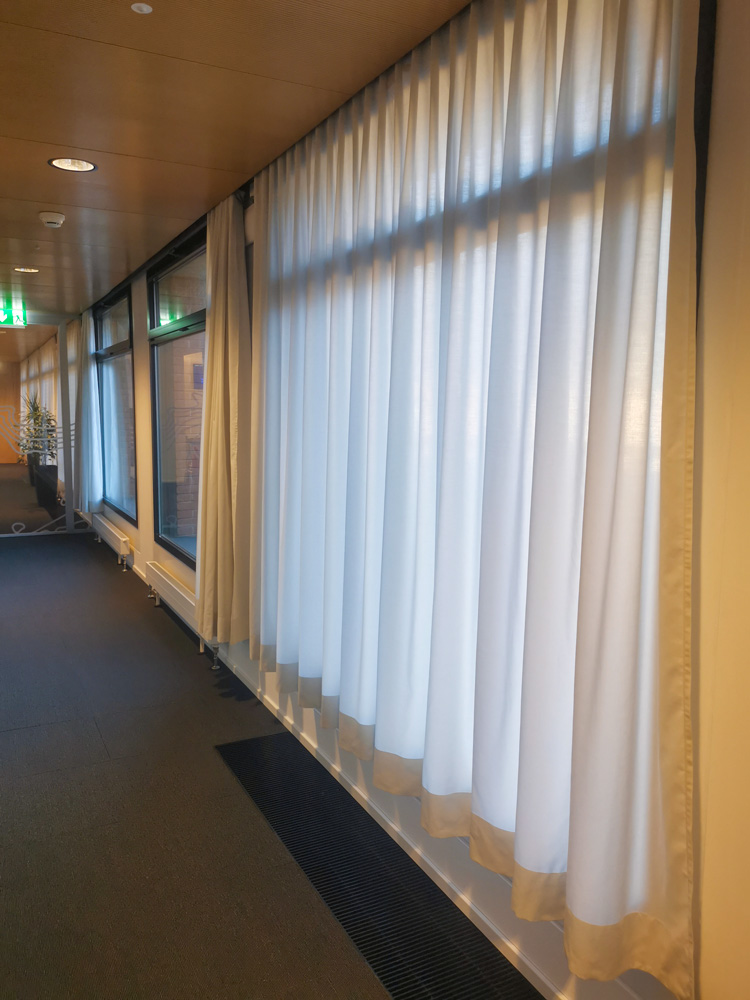 - nei corridoi e nelle aree di passaggio, tende luminose e leggere, in grado di filtrare la luce naturale riducendo i riflessi, senza sacrificare la luminosità complessiva degli ambienti.